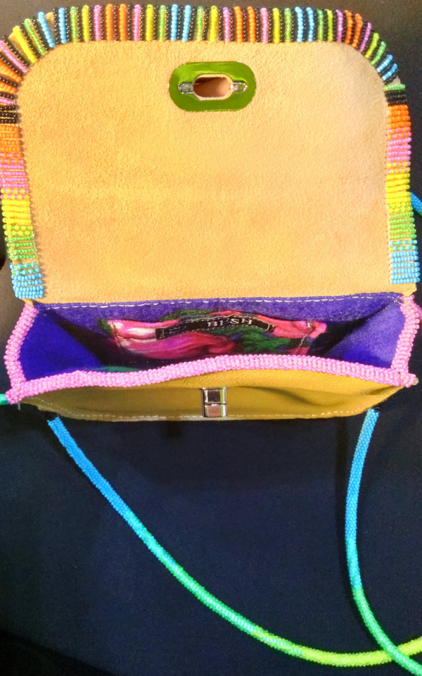 Handcrafted by Navajo Artist BESH. 6"x5"x2" beaded leather handbag, one of a kind. (2) Two beaded interchangeable straps included with handbag. One CC size inside pocket.